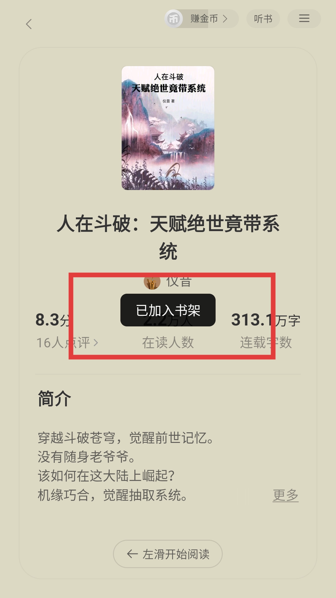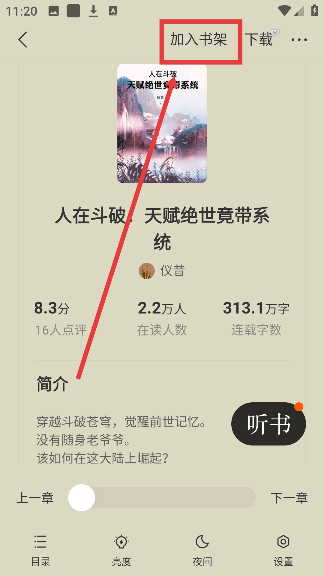 在小说详情页面点击【加入书架】按钮,就能把这部小说添加到书架中,方便之后继续阅读。