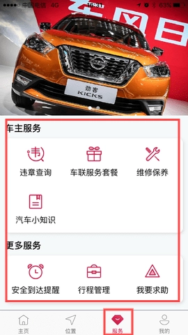 3、在【服务】中可以查询车辆位置和维修保养等。