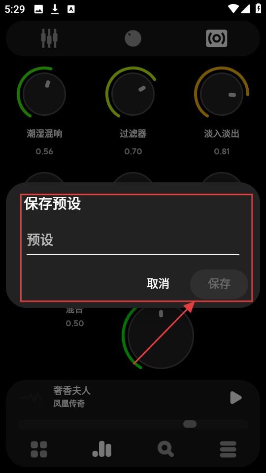 4、点击【保存】后,会弹出【保存预设】窗口,输入预设名称,再点击【保存】,就能把这个音效预设存下来啦。