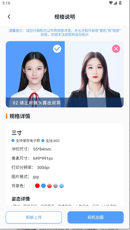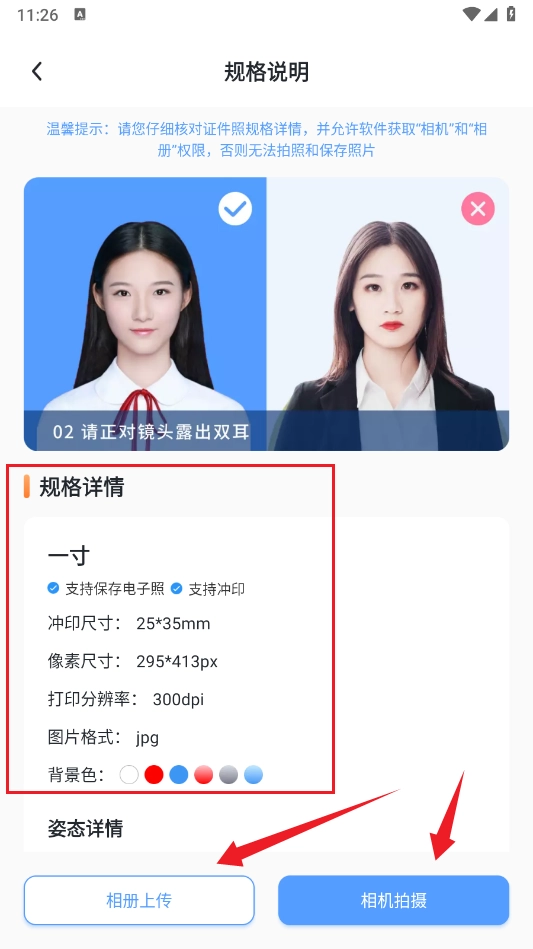 3、以一寸照制作为例,进入功能页面后,可先查看规格说明(如图所示)。制作时既可以从本地上传照片,也能通过相机拍摄获取证件照素材。