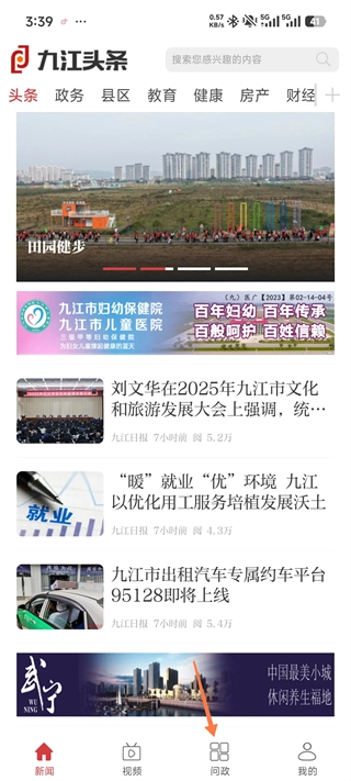 打开九江头条App后,在首页就能浏览各类新闻资讯,接着点击底部的【问政】按钮即可。