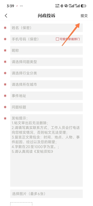 在问政页面的右下角,找到并点击【我要投诉】按钮,即可进入投诉信息的填写界面。