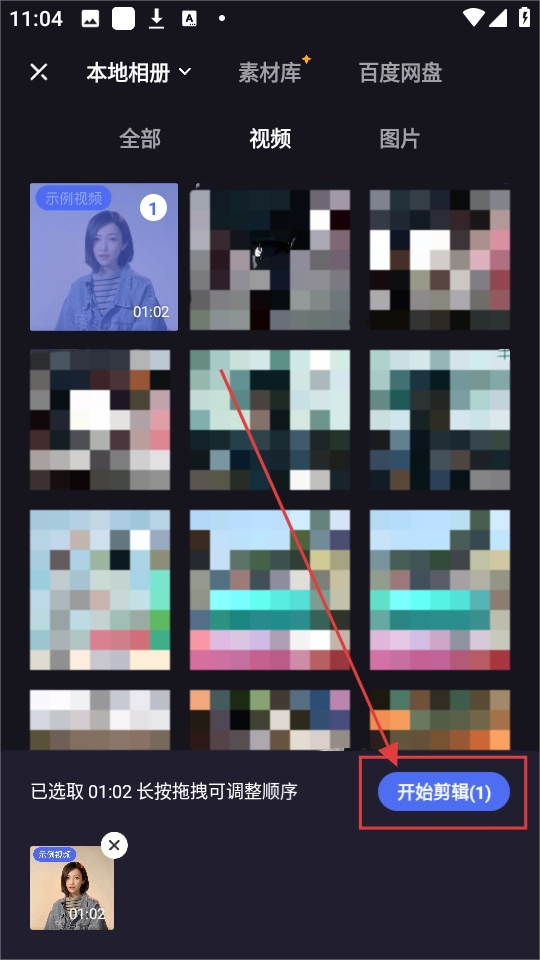 2、在素材选择页面,挑选好视频素材后,点击【开始剪辑(1)】按钮,就能进入视频剪辑页面啦。