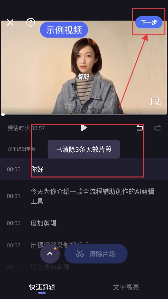 4、把无效片段清理掉之后,点击【下一步】按钮,就能接着完成视频剪辑的流程啦。