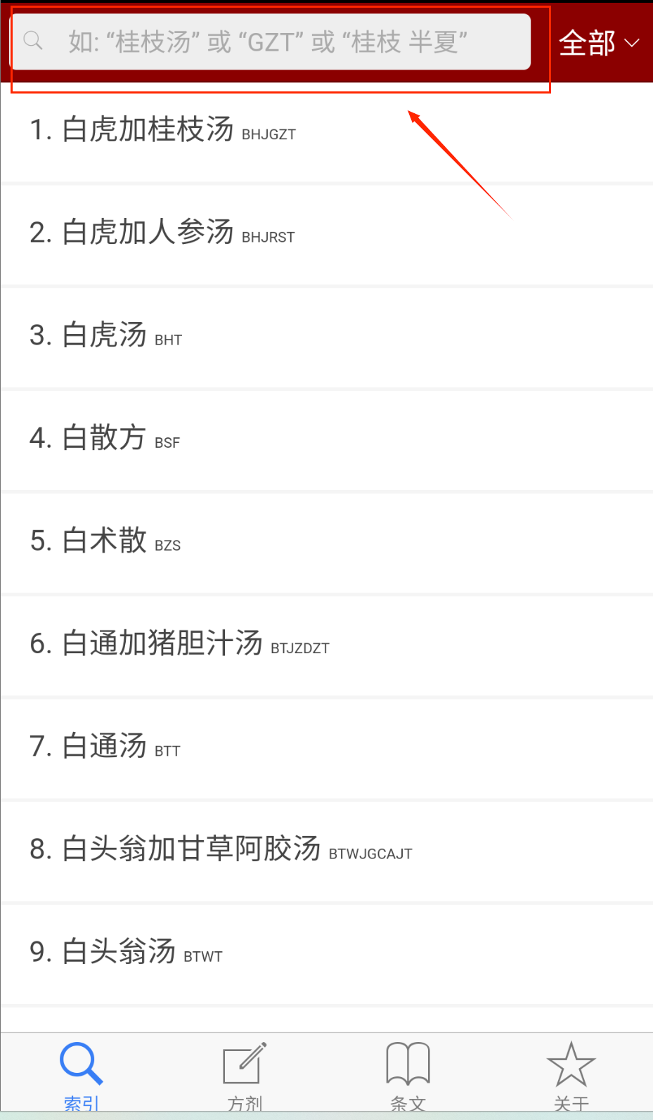 1、打开小猴掌上伤寒论后无需注册登录,你可以直接先在索引里查询方剂。支持拼音首字母搜索,例如搜索“桂枝汤”时输入“GZT”即可,也能搜索“桂枝半夏”这类方剂。