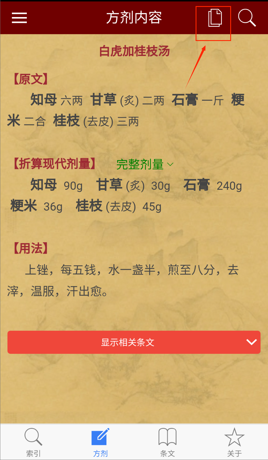 2、在方剂详情页面里,你可以点击右上角的按钮,把整个方剂内容复制到剪贴板。