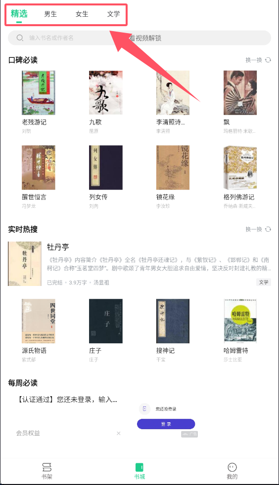 1、打开软件后,首先看到底部有书架、书城和我的三个核心导航。点击书城,上方有精选、男生、女生、文学等分类标签。