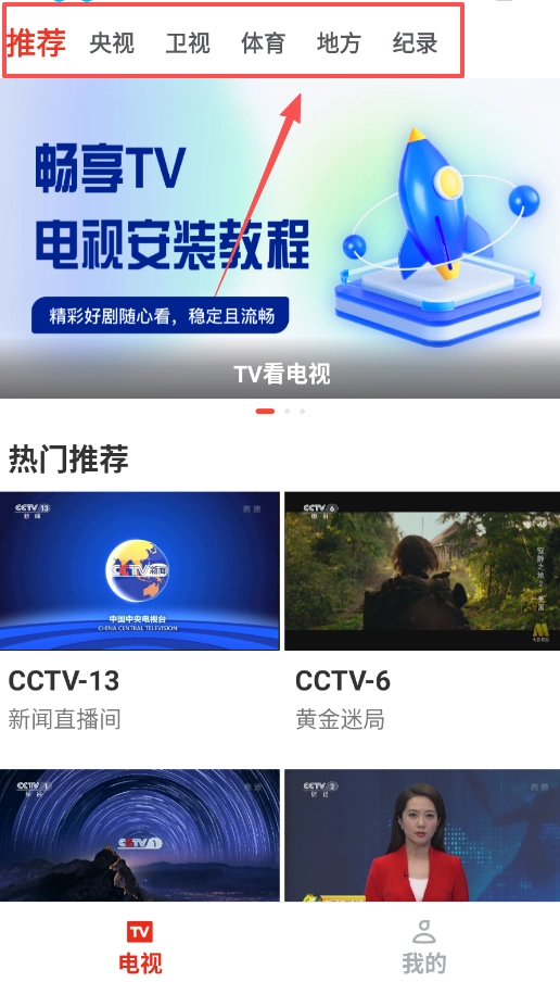 进入推荐页面后,顶部设有分类导航栏,涵盖央视、卫视、体育、地方、纪录等类别,只需滑动选择即可快速切换频道类型。