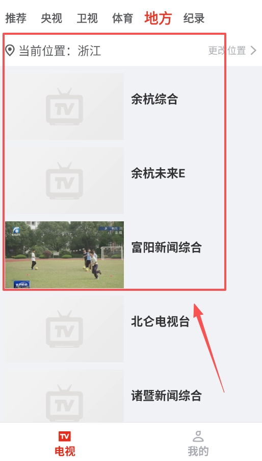4、切换地理位置的操作十分简便,只需在地方分类里点击当前所在位置(例如浙江),接着选择更改位置的选项,即可切换至余杭、富阳或者北仑等地的地方台。