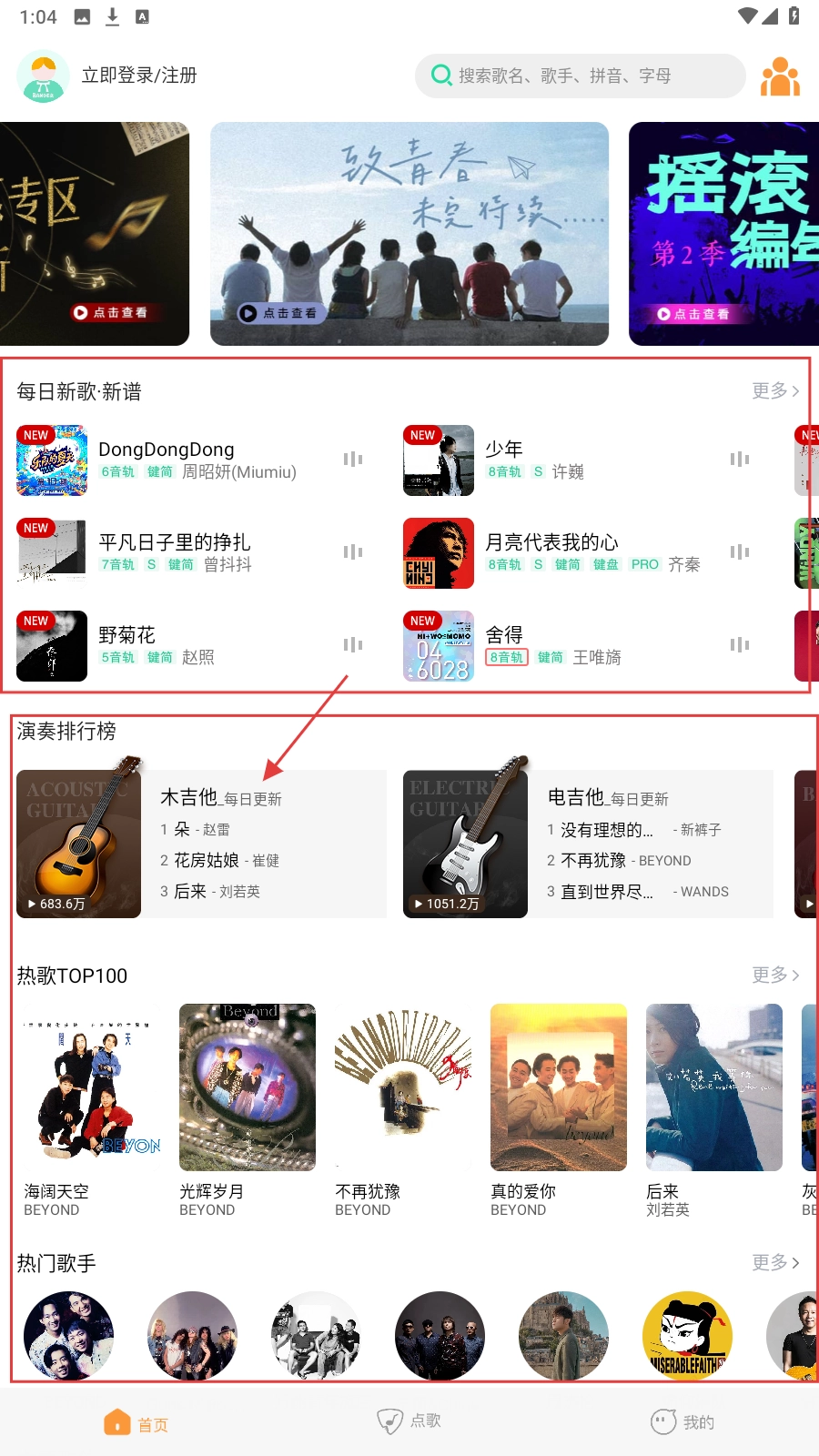 打开应用后,首页设有【每日新歌新谱】【演奏排行榜】等板块,用户可依据个人喜好选择进入相应板块。