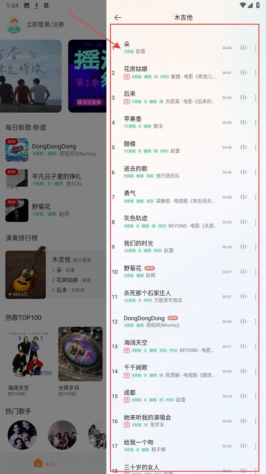 2、要是对【木吉他】演奏榜感兴趣,点击进入后,就能看到包含【朵】等歌曲的列表,点击即可播放。