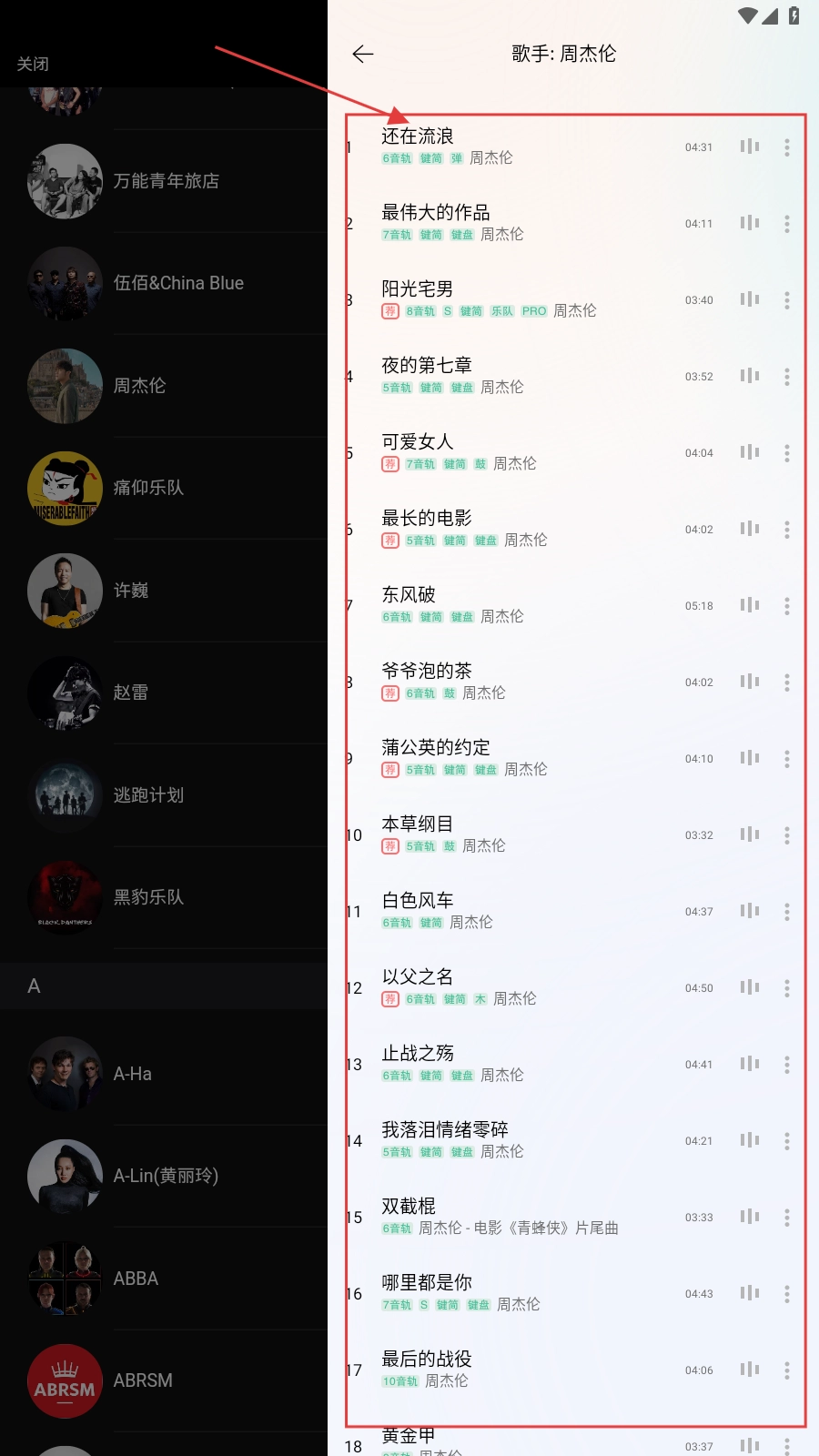 4、挑选歌手(例如【周杰伦】)后,能够查看其包含【还在流浪】等歌曲的歌单,点击即可播放。
