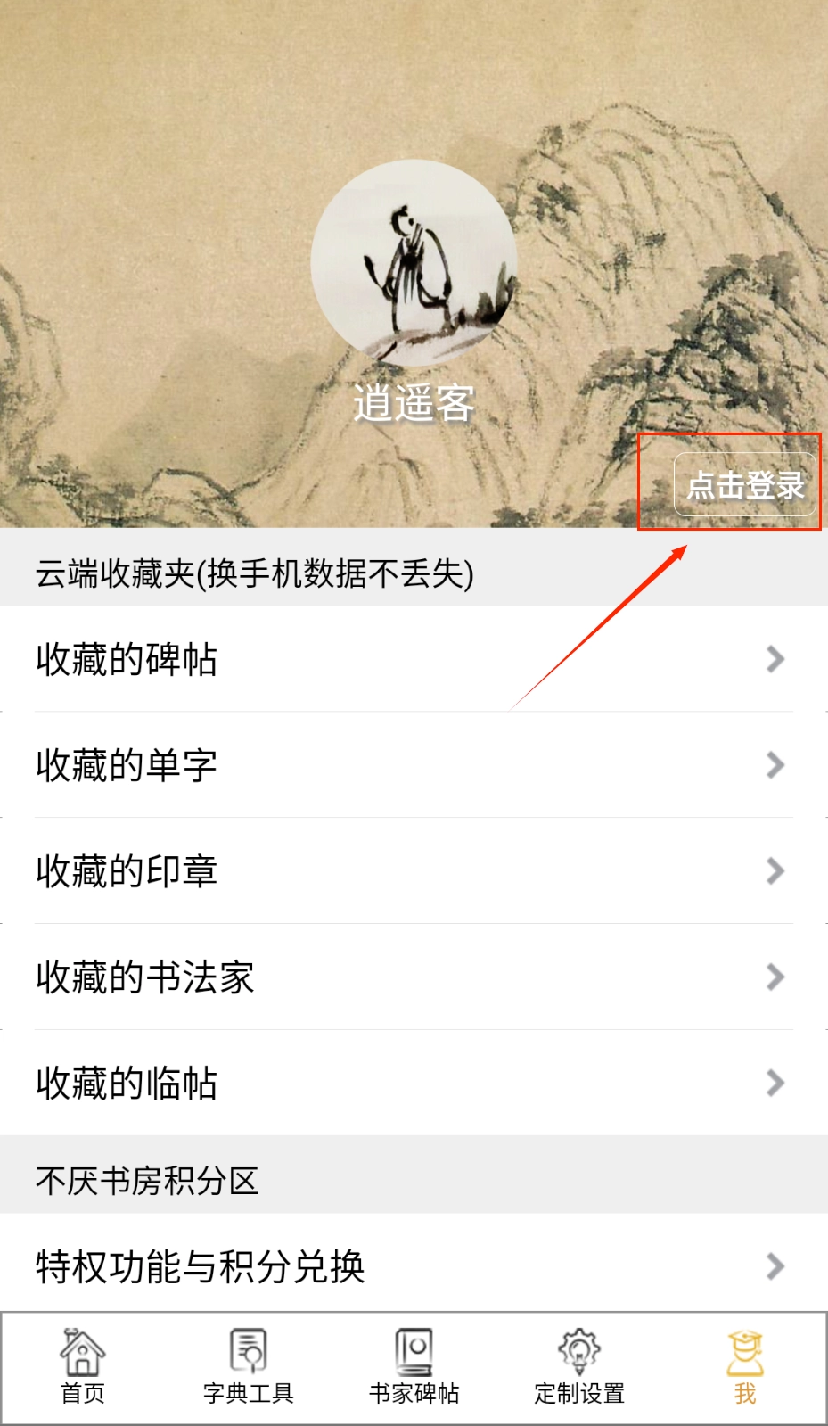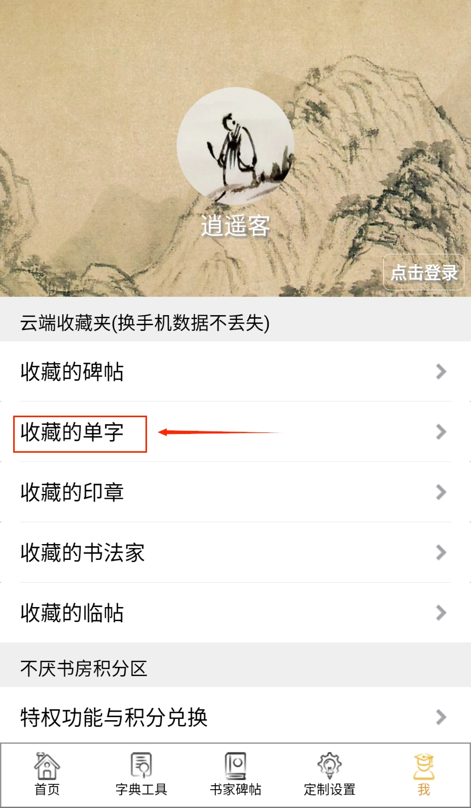 2、进入主界面浏览“收藏的碑帖”或“单字”模块。