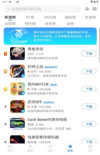 4、榜单功能分为新游榜、BT榜、MOD榜、国际榜、热游榜、谷歌榜、预约榜、单机榜和总榜