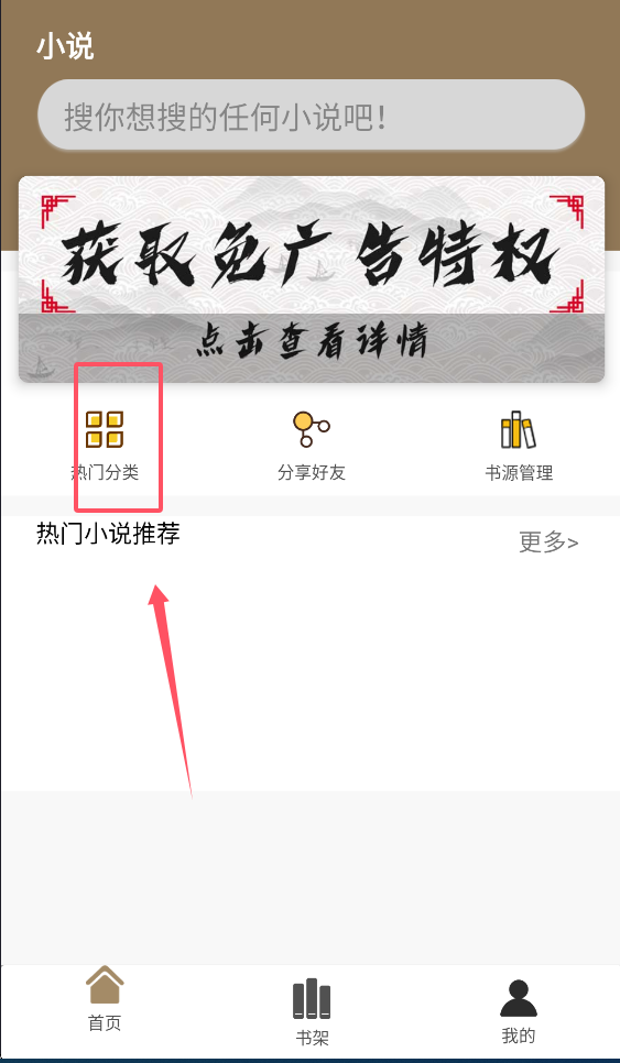 首页的布局设计十分直观,顶部设有搜索框,中部则排列着功能入口。新手用户可以先从热门分类开始探索找书,若想精准定位目标书籍,直接使用搜索功能即可;此外,页面还配备了分享按钮,方便大家随时推荐精彩的章节内容。