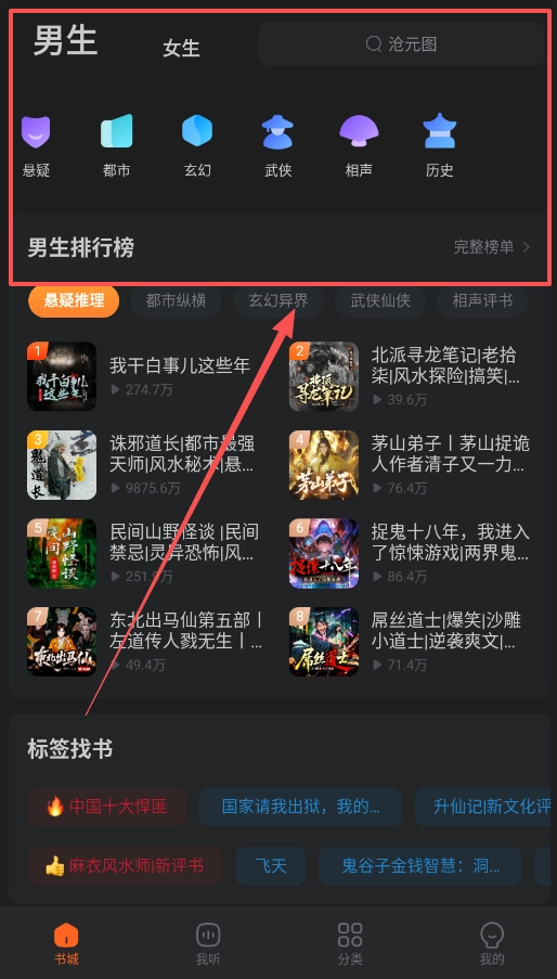 2、酷狗听书特殊区域分类,在分类各种类型的小说随你选择,男女的特殊区域满足每个人,
