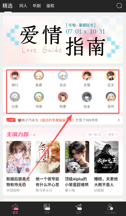 登录后,你会进入精选页面,这里设有同人、听剧、版权等多个分类;向下滑动页面,还能看到热门作品推荐以及主播力荐的书单。
