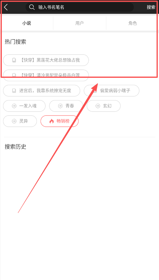 3、若你想查找特定小说,可点击顶部的搜索图标,在搜索框中输入书名、笔名或关键词,系统便会呈现热门搜索与历史记录。