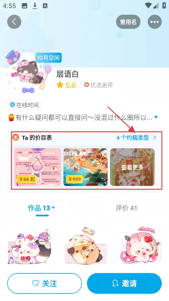 4、在价目表页面,确认好约稿类型和价格后,点击【快捷邀请】,就能发起约稿邀请啦。