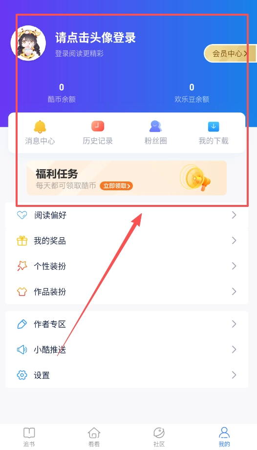 1、第一步,请点击屏幕左上角的头像完成登录操作,这是后续管理账户、查看酷币以及查阅阅读历史的基础步骤。