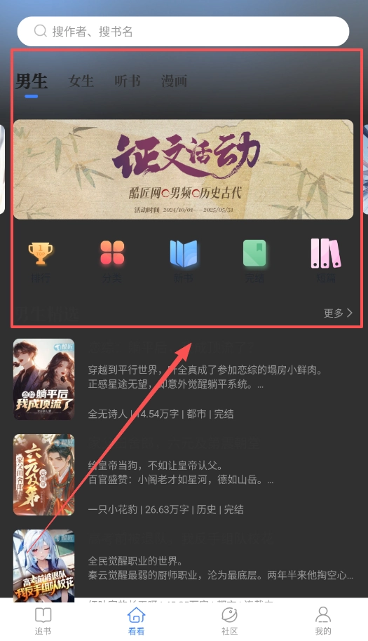 在首页,你既可以直接借助顶部的搜索框来查找书籍,也能通过“男生”“女生”这类分类去浏览并发现自己感兴趣的故事。