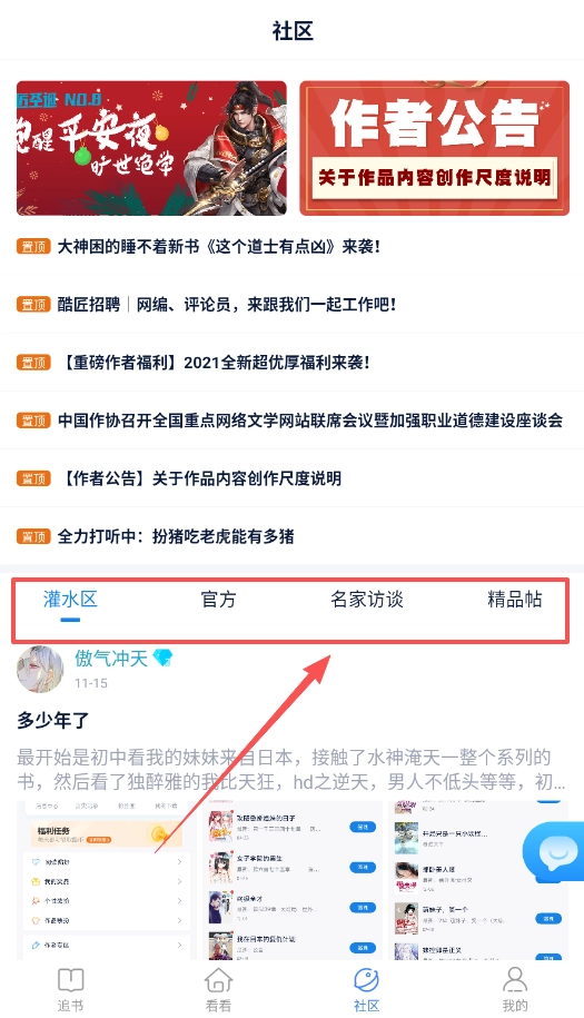 3、进入“社区”页面后,你可以在这里查看公告、参与书友间的讨论,还能知晓平台的最新动态以及作者相关资讯。