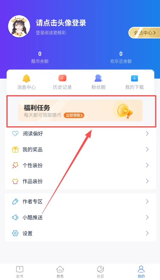 4、别忘了定期去“福利任务”板块看看,把每日任务做完来攒酷币,这些酷币能让你在阅读的时候更方便些。