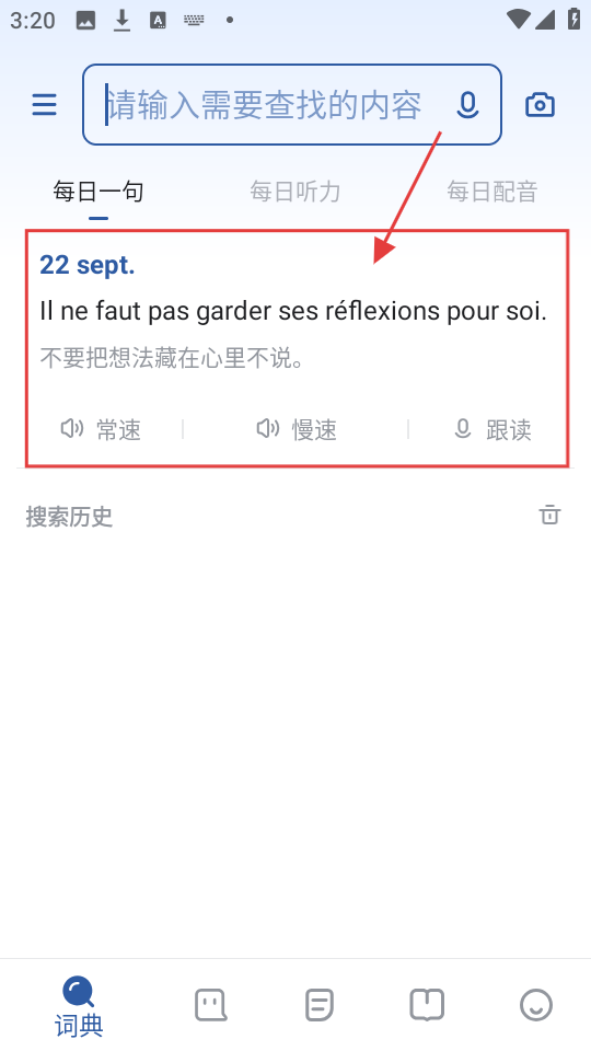 1、在应用界面,可查看【每日一句】的法语句子及中文翻译,还有【常速】【慢速】【跟读】等功能可使用。