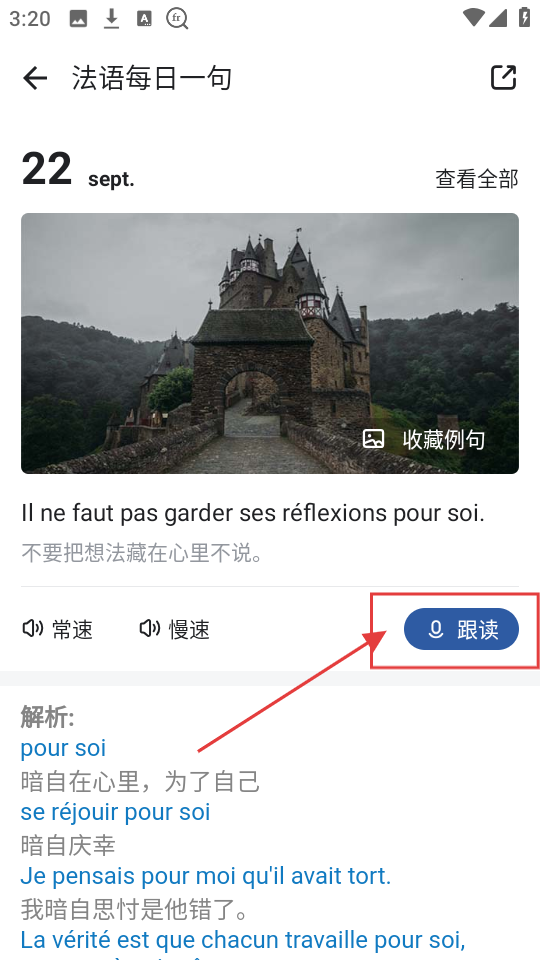 2、进入【法语每日一句】详情页,能看到句子、配图等,点击【跟读】按钮,可进入跟读界面练习发音。
