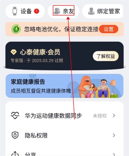 5. 搭载健康算法,如同在腕间配备了人工智能“脉诊师”,增强智能穿戴设备的实用价值。1. 用户于个人中心处点击上方的“亲友”选项。