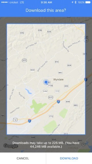 4、屏幕上会出现一个方框,它会突出显示地图的某一片段。你可以移动这个方框,使其覆盖你想要保存下来以便离线使用的区域。另外,你也能通过放大或缩小操作,来调整你所选择区域的范围大小。