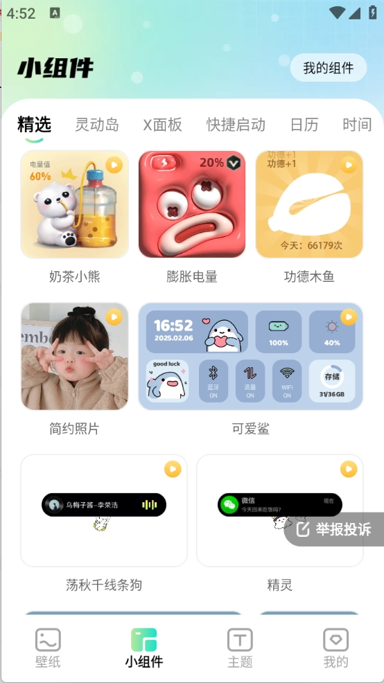 3、小组件页面包含多种不同类型的组件,像灵动岛、X面板和日历等都在其中。