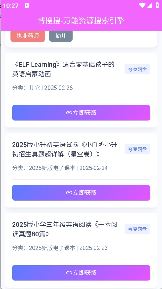 博搜搜App是一款功能强大的搜索引擎,能够对百度网盘、阿里云盘、夸克云盘等主流网盘的资源进行全文检索。借助这款应用,用户可以便捷地查找影视、短剧、文档等各类资源。