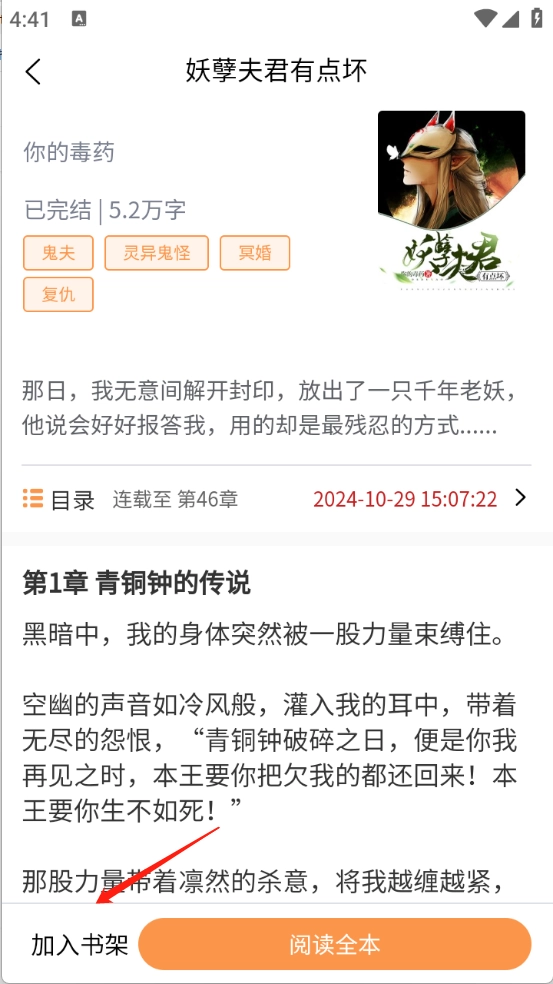 1、打开想看的小说进入详情页,点击“加入书架”。