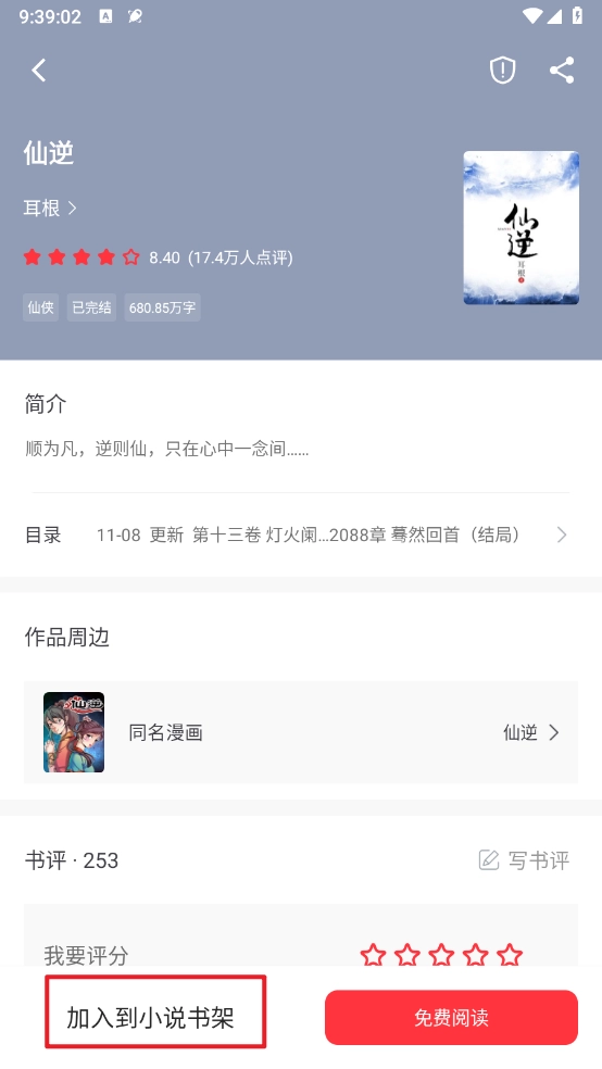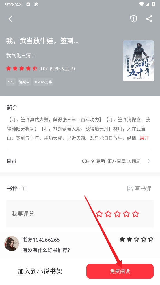 2、进入小说详情页,点击"免费阅读"一键打开。