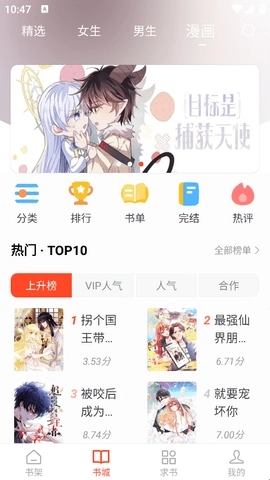 1、大家进入“书城”后,找到顶部导航栏里的“漫画”选项,点击它就能进入漫画板块了。