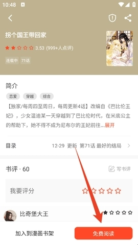 3、点击进入漫画资源简介,点击“免费阅读”。