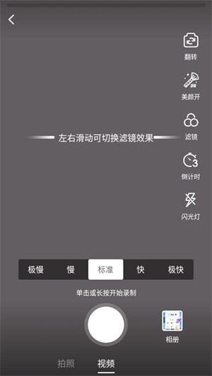 4、点击拍摄后,用户能够自由选择拍摄视频或照片来发布内容,同时这里还提供了美颜滤镜、闪光灯等实用功能。