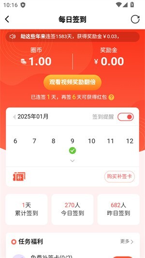 2、进入每日签到页面,用户不仅能通过签到获取圈币,页面下方还设有各类任务,帮助大家轻松赚取圈币。