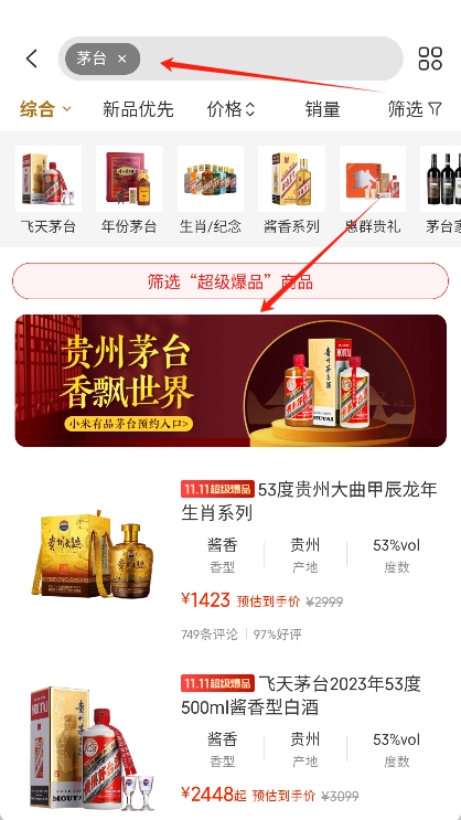 4、点击搜索框并输入“茅台”执行搜索操作,待找到茅台预约入口后点击进入该页面。