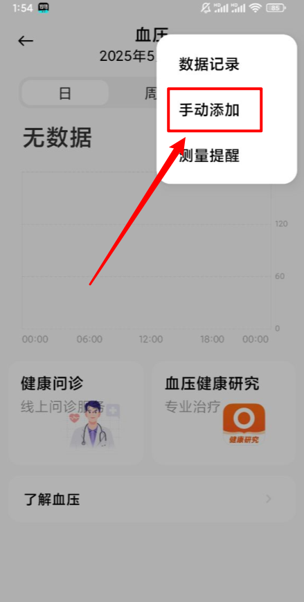 2、进入血压页面点击右上角三个点,如图。