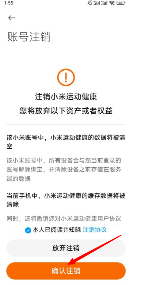 4、在账号注销页面点击"注销小米运动健康"。