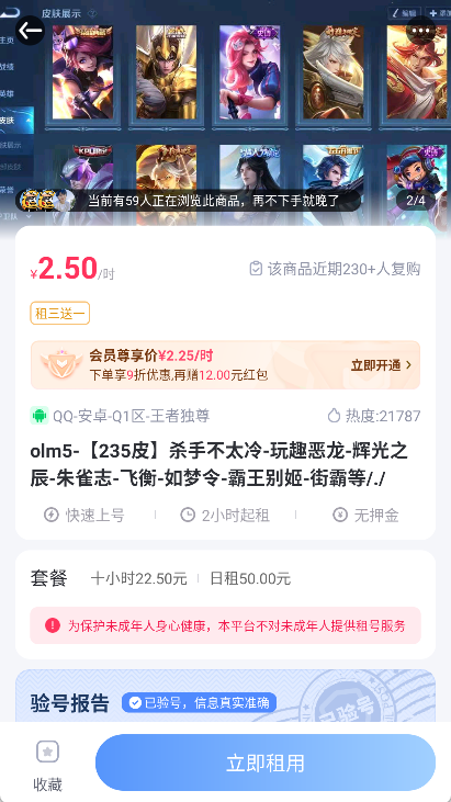 4、确定好租赁时长后,点击“立即租用”按钮就能完成租号流程。