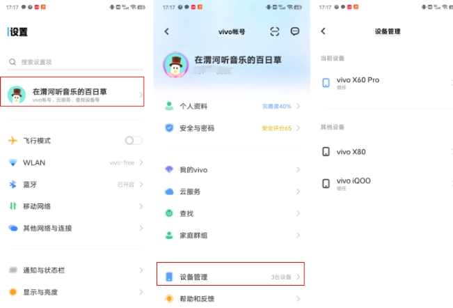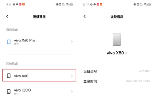 1. 您可以通过手机的“设置”进入“vivo帐号”,再找到“设备管理”选项,就能查看该帐号的登录设备信息了。