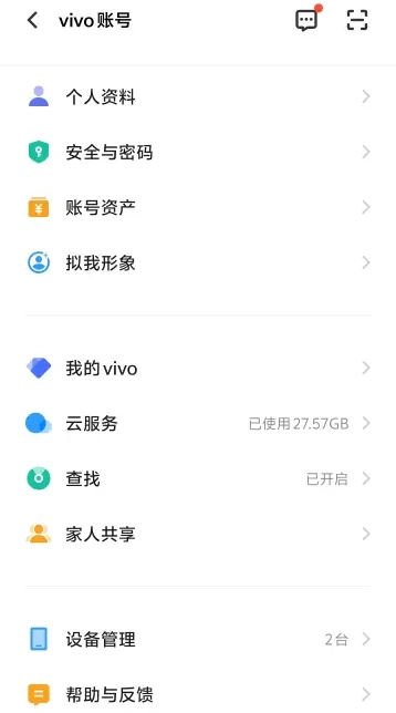在“设置”的顶部位置,能够打开vivo帐号,进而开展密码修改、安全管理之类的操作。
