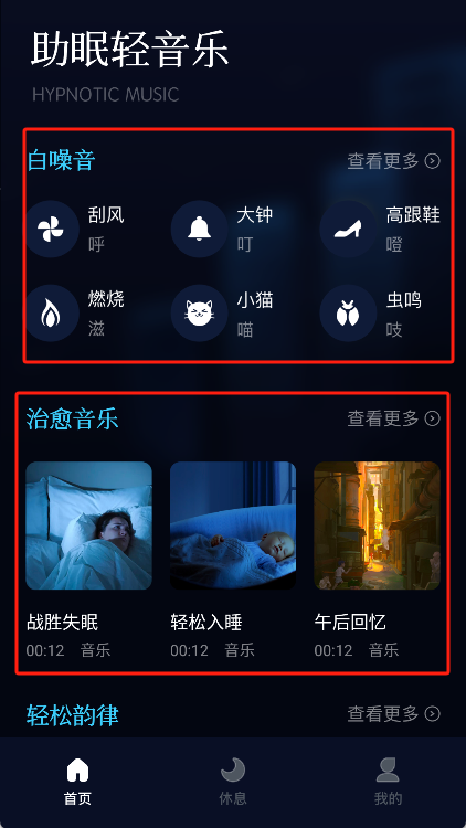 在主界面,用户能够通过浏览各类不同的分类(像白噪音、治愈音乐这类)来找到自己感兴趣的内容。