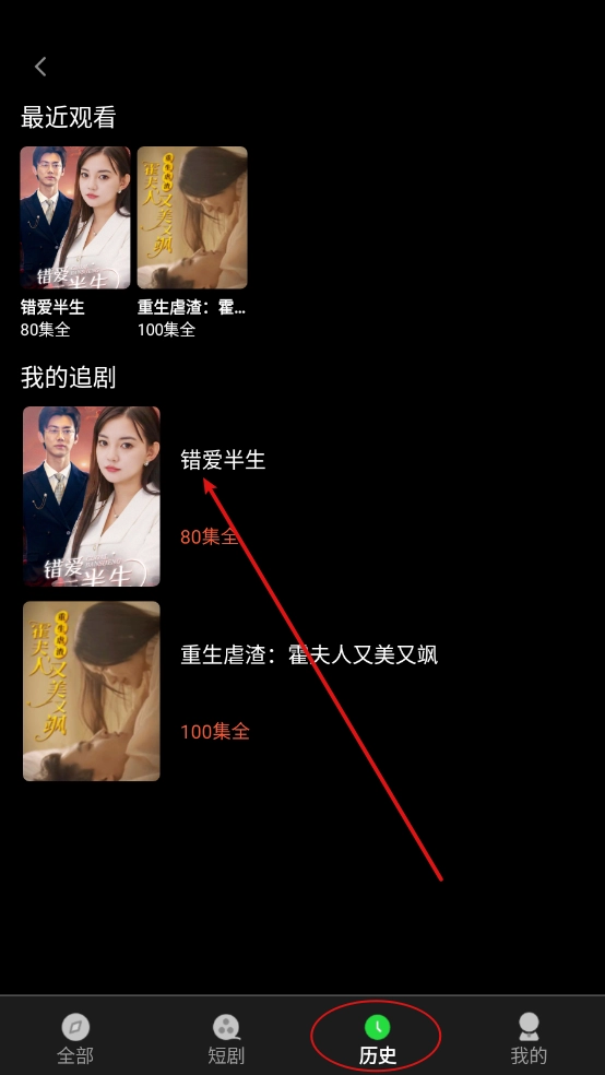 5、最后在“历史记录”里,就能看到收藏的短剧,方便下次观看。