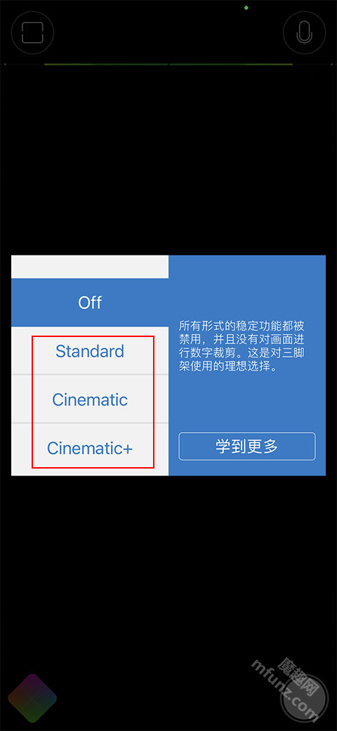软件提供了不同的稳定性模式,包括关闭、标准、Cinematic、Cinematic+等。