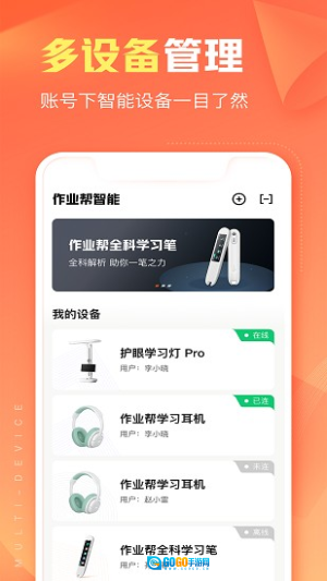 设备管理中心可添加作业帮全科学习笔等硬件设备,单个账号能够管理多台设备,从而实现对全家孩子学习进度的统一监管。
