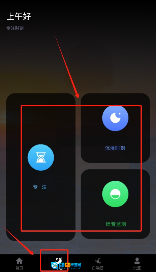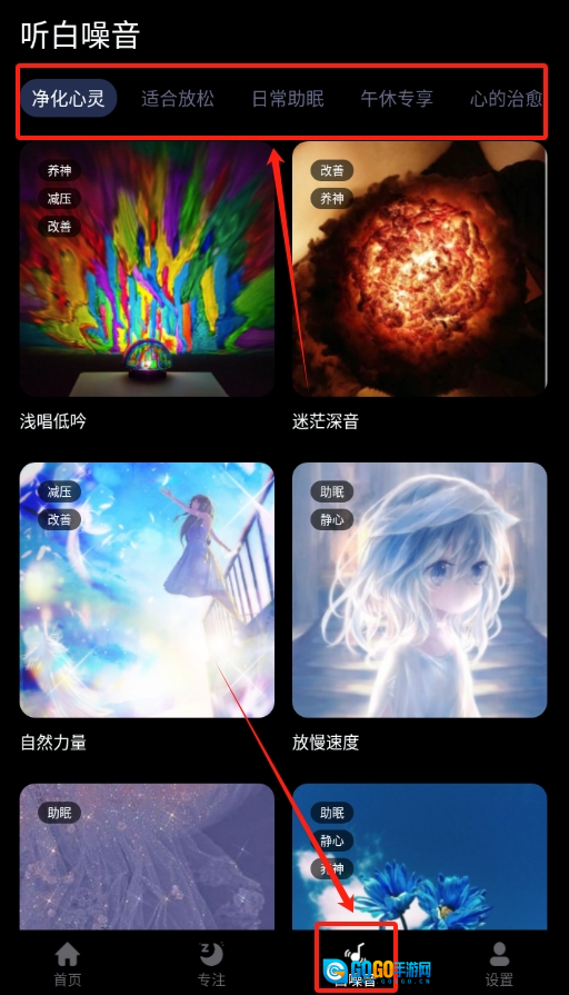 3、想要放松入眠时,找到白噪音功能,播放喜欢的音效,伴着轻柔声音进入梦乡。